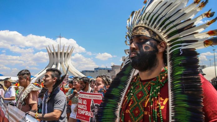 Para acompanhar o julgamento no STF, indígenas estão mobilizados em Brasília. Eles também se manifestam contra a tentativa do Senado de legalizar o marco temporal.