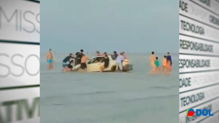 Na manhã desta sexta-feira (7), um carro do tipo 4×4 atolou na praia e muitas pessoas tentaram retirar o veículo das águas usando a força física, mas não conseguiram. No vídeo que circula pelas redes sociais, é possível ver que trata-se de um momento difícil.