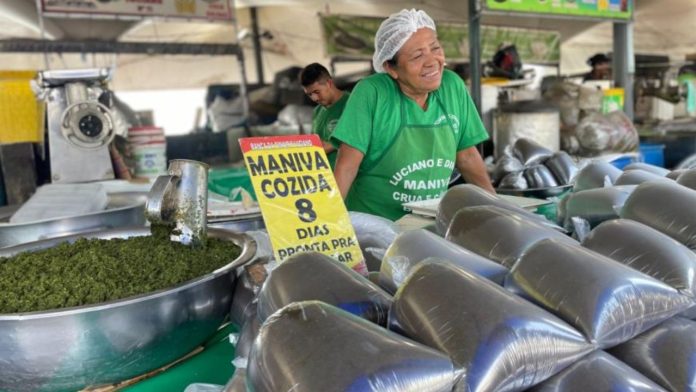 Ela trabalha com a venda de maniva pré-cozida, principal ingrediente da maniçoba, comida sempre presente nas mesas paraenses no almoço da festa religiosa, realizada no segundo domingo de outubro.