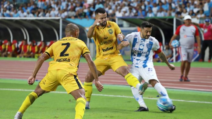 O Paysandu tinha tudo para conquistar o acesso à Série B do Campeonato Brasileiro neste domingo (1º), mas a derrota para o Amazonas por 2 a 1 estava fora dos planos. Agora, tudo ficou para a última rodada, com o Papão decidindo a vaga em confronto direto com o Volta Redonda.Os bicolores até saíram na frente, com gol de Mário Sérgio, mas tomou a virada com Igor Bolt e Sassá e decepcionou 50 mil torcedores que estiveram presentes no Mangueirão e fizeram uma grande festa, com direito a mosaico 360 e 3D.No Rio de Janeiro, o Lobo só perde o acesso em caso de derrota por dois gols de diferença, já que tem saldo de +2 contra -2 do Voltaço. Nos critérios de desempate, desempataria no quarto critério, que é justamente o confronto direto.Primeiro Tempo:A partida começou muito elétrica, com as equipes se atacando. Mário Sérgio teve grande chances logo com oito minutos e perdeu sozinho na área, após cruzamento de Edílson. Os lances eram disputados e com nove minutos já havia um amarelo para cada lado.Com 14 minutos, o árbitro Rodrigo José Pereira de Lima (PE) marcou pênalti de Edílson em Diego Torres, mas o VAR corrigiu a marcação e assinalou fora da área. Enquanto isso, Matheus Nogueira ia tendo trabalho nos escanteios  fechados do próprio Diego Torres.O Paysandu melhorou no jogo e passou a ficar mais tempo no ataque. Aos 24 minutos, Robinho cruzou e Mário Sérgio se antecipou à zaga e abriu o placar, fazendo o Mangueirão explodir e aproximando o Papão do tão sonhado acesso.O gol fez o Amazonas se espertar novamente e partir para cima e tentar o empate nos lances seguintes, mas a defensiva bicolor era soberana. Robinho chamava a responsabilidade e ditava o ritmo do Papão. Enquanto isso, a Fiel Bicolor não parava de cantar nas arquibancadas.Mário Sérgio perdeu mais um aos 39 minutos, após desviar, na pequena área, cruzamento rasteiro de Robinho. Bola tirou tinta da trave. Aos 41, Sasá marcou, mas estava impedido. No entanto, aos 44 Igor Bolt deixou tudo igual em um chute de fora da área e o jogo foi empatado para o intervalo.Segundo Tempo:O Papão voltou com Jacy Maranhão no lugar de João Vieira, mas o Amazonas era melhor e não demorou muito para buscar a virada com Sassá, aos 11 minutos. Após isso, Kevyn e Alencar deixaram o campo para as entradas de Eltinho e Geovane, respectivamente.O tempo foi passando e o Paysandu precisava de um empate. Juninho entrou no lugar de Nicolas Careca para dar maior mobilidade para a equipe no ataque. Sem mudança na postura, foi a vez de Ronaldo Mendes entrar em campo na vaga de Wellington Carvalho.O Papão não conseguia furar a defensiva da Onça Pintada. A criação era zero e os atacantes não tinham chances de gol. Com a torcida nervosa, assim como os jogadores, os erros começaram a aparecer e a primeira derrota no quadrangular veio.