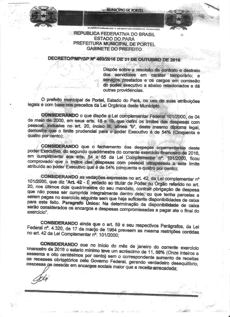 O prefeito do município de Portel Sr. Vicente de Paulo Ferreira usando das suas atribuições legais fez saber na tarde dessa sexta-feira (04) através do Decreto nº 043/2016, de 31 de outubro de 2016, a demissão de 510 funcionários.