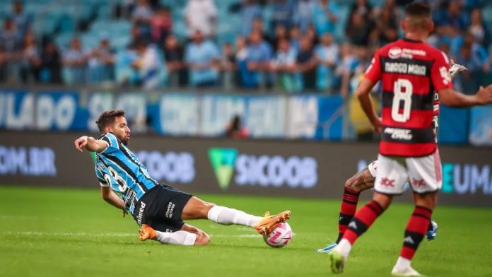 Na noite desta quarta-feira (25), o Flamengo enfrentou o Grêmio, em Porto Alegre, em uma partida intensa que terminou com vitória do time gaúcho por 3 a 2. Embora o ex-gremista Cebolinha tenha aberto o placar para o Rubro-Negro no final do primeiro tempo, o Grêmio, com um desempenho quase perfeito na segunda etapa, garantindo a virada com gols de Ferreira, Nathan e André. Um gol tardio de Luiz Araújo não foi suficiente para uma reação completa do Flamengo.CONTEÚDO RELACIONADOPalmeiras goleia o São Paulo em clássico no BrasileirãoFluminense vence jogo eletrizante contra o Goiás por 5 a 3Cruzeiro vence o Bahia e se afasta da zona de rebaixamento