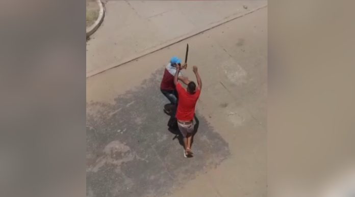 Nas imagens um dos homem aparece com um facão na mão tentando golpear a vítima que se defende das agressões com uma mochila, logo depois ela cai no chão e tenta segurar o objeto cortante.