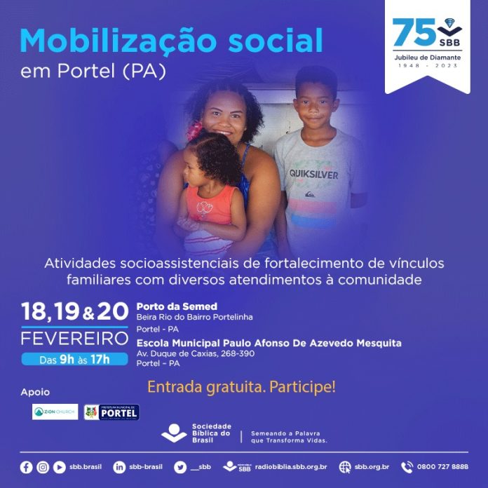 A mobilização social em Portel/PA tem como objetivo principal fortalecer os veículos familiares através de diversos atendimentos à comunidade. A Sociedade Bíblica do Brasil (SSB) está organizando este evento de 18 a 20 de fevereiro, das 9h às 17h, em duas localidades: o Porto da Semed (beira rio no bairro da Portelinha) e a EMEF Paulo Afonso (Av. Duque de Caxias).