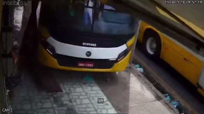 Um ônibus da linha Icoaraci-Centro perdeu o controle e invadiu a calçada na manhã desta quinta-feira (15). O acidente ocorreu na Avenida Pedro Álvares Cabral, no bairro do Telegrafo, em Belém. Imagens de câmeras de seguranças mostram o momento em que o veículo, com passageiros, perde o controle,  invade a calçada e destrói a cobertura de um estabelecimento comercial. Sem freio, o ônibus também acerta um posto de energia e por pouco uma idosa não é atingida. A idosa estava na frente do estabelecimento comercial quando é surpreendida pelo ônibus. Sem ter para onde correr, a mulher se encolheu junto ao portão do prédio e conseguiu escapar ilesa. Ainda não se sabe o que causou o acidente, mas, nas imagens, é possível ver que um ônibus para na parada para pegar passageiros, já o veículo que vem atrás não consegue frear e acaba causando o acidente. Veja o vídeo