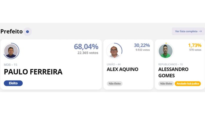 Paulo Ferreira foi reeleito prefeito da cidade com expressivos 22.365 votos, consolidando uma vitória significativa sobre seus adversários. O segundo colocado, Alex Aquino, obteve 9.933 votos, seguido por Alessandro Gomes, com 570 votos.