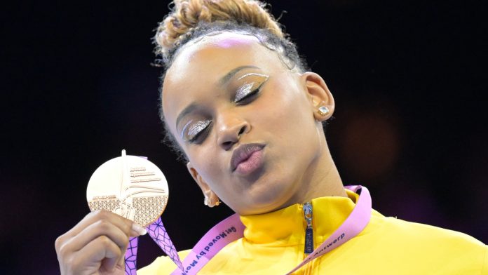 Rebeca Andrade, 24, conquistou pódio inédito em sua carreira durante uma disputa de trave neste domingo (8). A ginasta brasileira fez a terceira melhor pontuação média (14.300) e levou medalha de bronze no Mundial de Ginástica Artística, realizado na Antuérpia, na Bélgica.