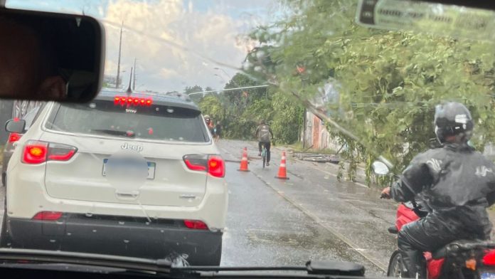 Conteúdos relacionados:Seca no Amazonas traz preocupações sobre estiagem no ParáDesmatamento é recorde em setembro no cerradoNo registro feito por um cinegrafista amador, é possível ver boa parte do muro no chão e as árvores caídas. Além delas, um poste de energia também estava arriado. As árvores de grande porte obstruíram parte das vias da avenida Centenário com a Júlio César, sentido avenida Augusto Montenegro, interferindo no fluxo de veículos que trafegavam no local.