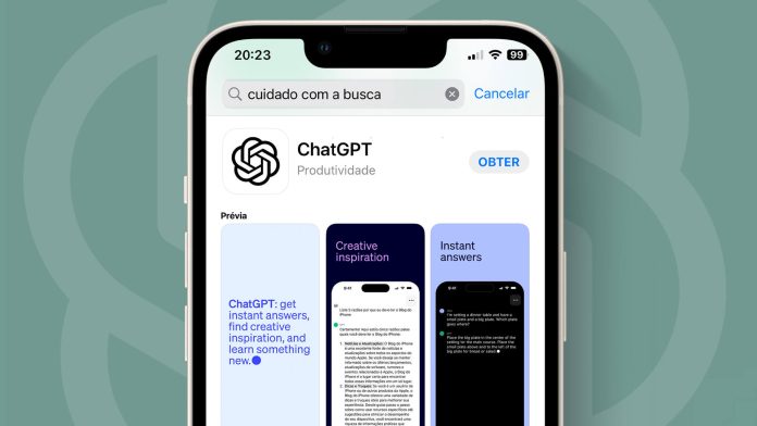 A reportagem baixou o ChatGPT em um aparelho iPhone. Ao realizar a busca, porém, a App Store retornou primeiro vários aplicativos que simulam as aplicações do ChatGPT. O programa correto (disponível neste link) é distribuído pela OpenAI, startup criadora da inteligência artificial geradora de texto.