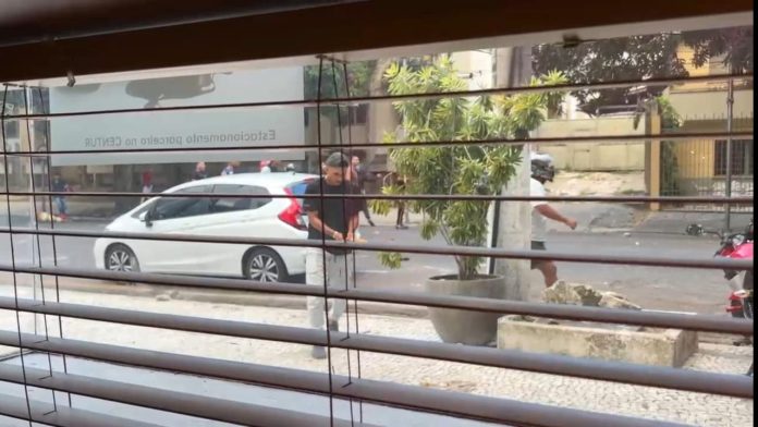 O futebol paraense vive grandes expectativas neste fim de semana, com a possibilidade do Paysandu conseguir o sonhado acesso à Série B do Campeonato Brasileiro. No entanto, o que era para ser um sábado de torcida pelo clube às vésperas do jogo decisivo acabou sendo marcado por cenas lamentáveis de violência entre torcedores.Integrantes de torcidas organizadas do Clube do Remo e do Paysandu entraram em confronto na tarde deste sábado (30) em pleno bairro de Nazaré, área nobre de Belém, próximo ao Centur.CONTEÚDO RELACIONADO:Clube do Remo expõe invasão de torcida organizada no BaenãoOrganizadas de Remo e Paysandu trocam pedradas em AnanindeuaVídeos registrados por moradores do local mostram que mais de 10 pessoas participaram do confronto, muitos em motocicletas. Vários deles usavam uniformes de torcidas organizadas. Guarnições da Polícia Militar que já estavam na região conseguiram conter a violência.As imagens mostram homens armados com pedras, rojões e de acordo com informações apuradas com exclusividade pela RBATV, também havia pessoas portando armas de fogo. Tiros chegaram a ser disparados.Os policiais militares usaram tiros para o alto e balas de borracha para dispersar os vândalos, que, inclusive, chegaram a disparar rojões e atirar pedras contra os agentes de segurança pública. Segundo o tenente Josafam, do 2º Batalhão da PM, uma pessoa foi presa e encaminhada para a Seccional de São Brás.Ele afirmou, ainda, que a inteligência da Polícia Militar já tinha ciência de que um confronto entre as torcidas organizadas estava marcado para ocorrer neste sábado e as guarnições já estavam de prontidão para coibir a violência.VEJA O VÍDEO!